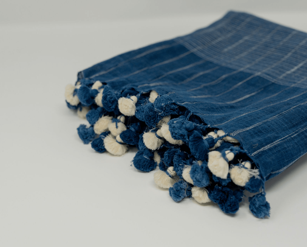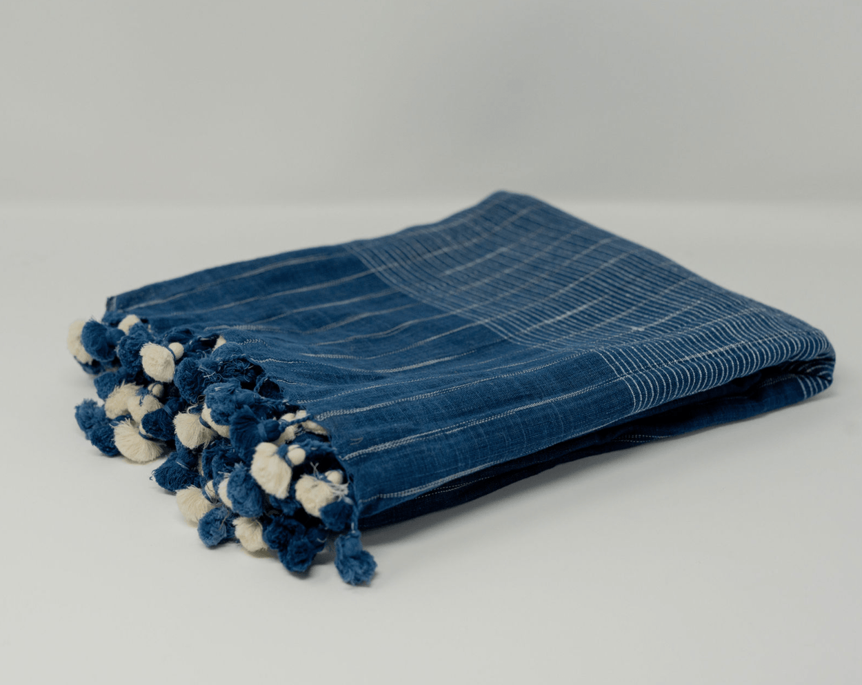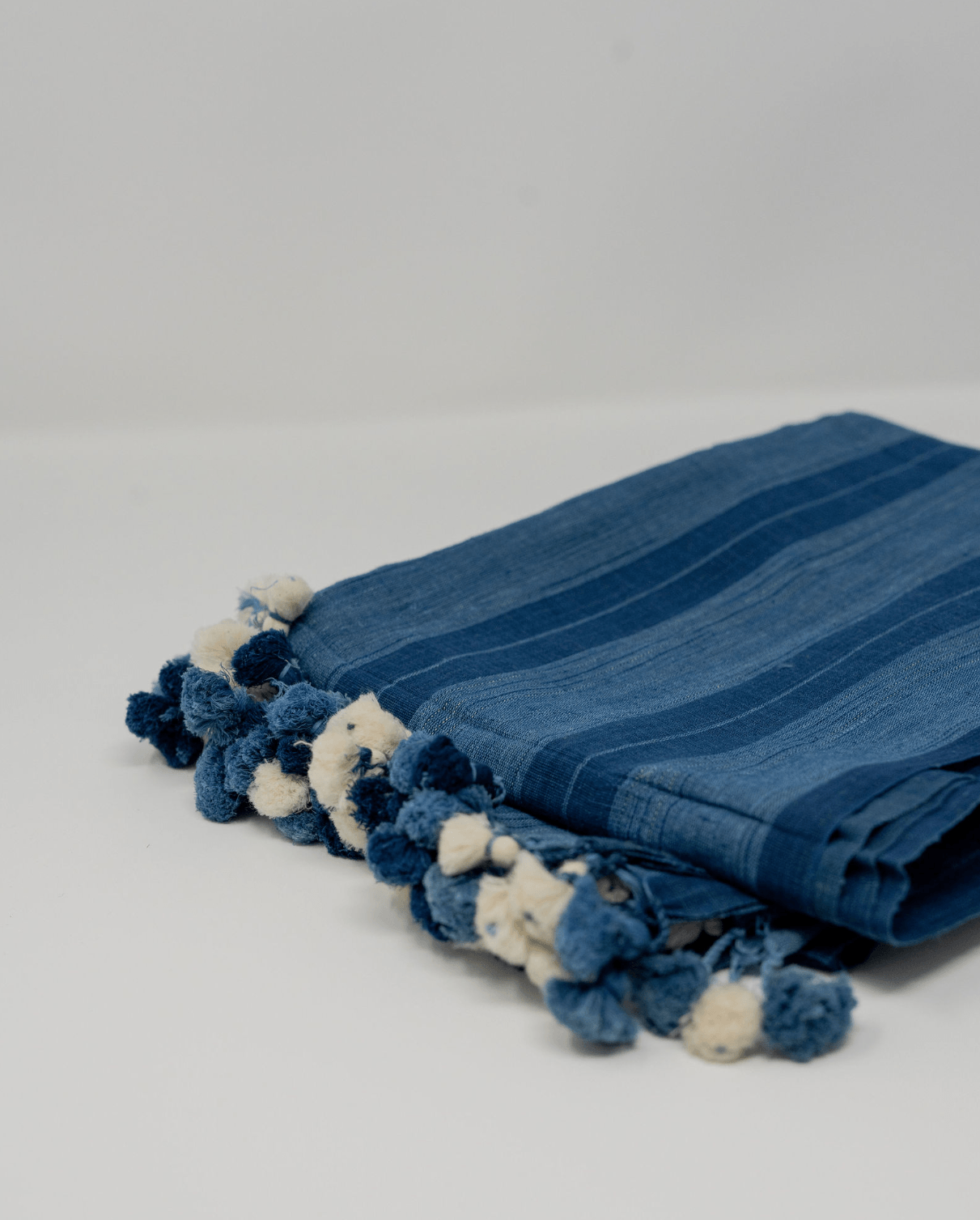 Our Bailou Indigo Striped Shawl is 100% handloomed indigenous cotton with various tones of indigo dye woven in the Bengal, India.